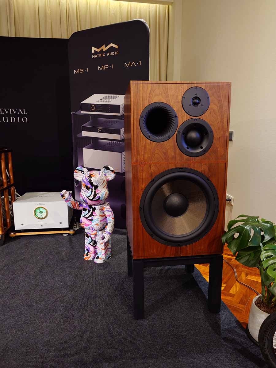 This room felt like walking into a very civilised modern salon, with a giant, technicolour Be@rbrick guarding the sweet spot. The visual spotlight was on the Revival Audio’s big Atalante floorstanders in classic walnut, the kind of wide‑baffle three‑way that looks like it should be parked in a Paris apartment full of jazz records.
