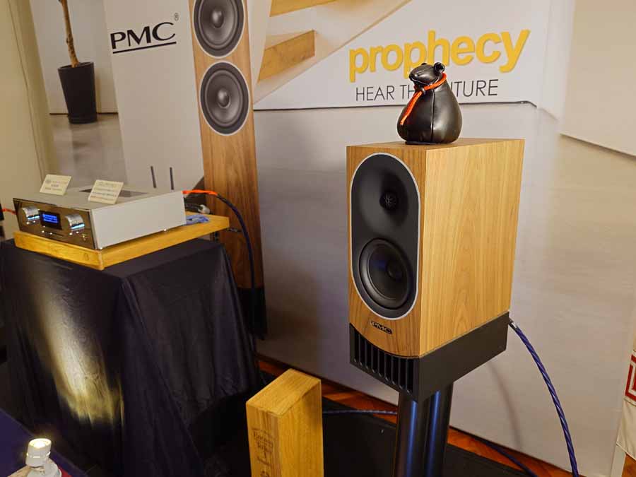 This was the room where three‑letter acronyms came to party: PMC’s new Prophecy 1 standmounts, part of the brand’s fresh Prophecy series, were teamed up with AVM’s CS 5.3 all‑in‑one, all wired and powered through in‑akustik cabling and power distribution with a sprinkling of Entreq boxes around. The little PMC/AVM combo had a neat “studio shrunk for the living room” vibe – compact, clean and more authoritative than its footprint suggests. Off to the side, an Edwards Audio Apprentice turntable and Cyrus 40‑series electronics sat on static display.