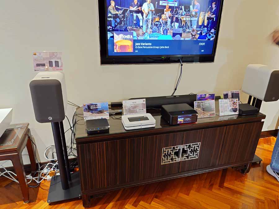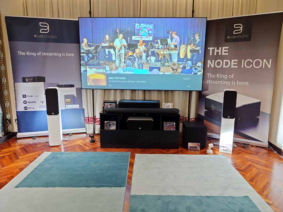 As a long‑time Q Acoustics fan, this was another must‑stop room for a quick reality check on what “sensible money” can actually do. They had one of the most appealing small systems of the show: the M20 active speakers bundled up with the new Bluesound Node Nano, a little combo that looked ready to slide straight into a living room or desktop without a domestic argument. Across the room, a full 5000-series home cinema layout took care of the bigger-screen dreams, while a table full of QED cables on the promo quietly tempted anyone planning to give their own system a bit of affordable TLC.