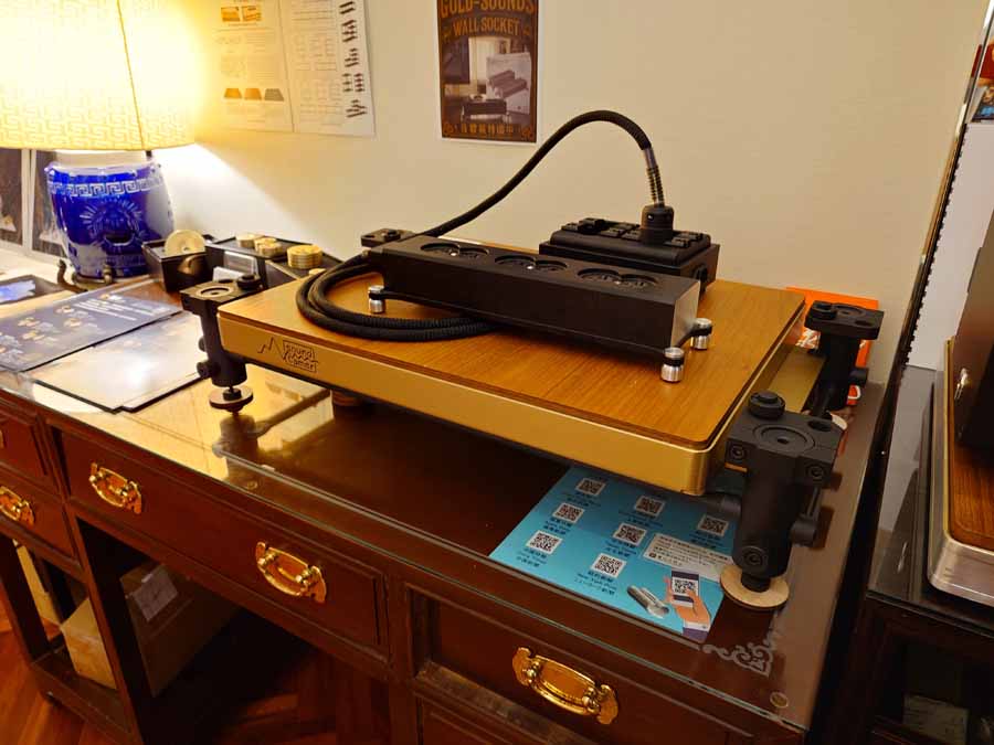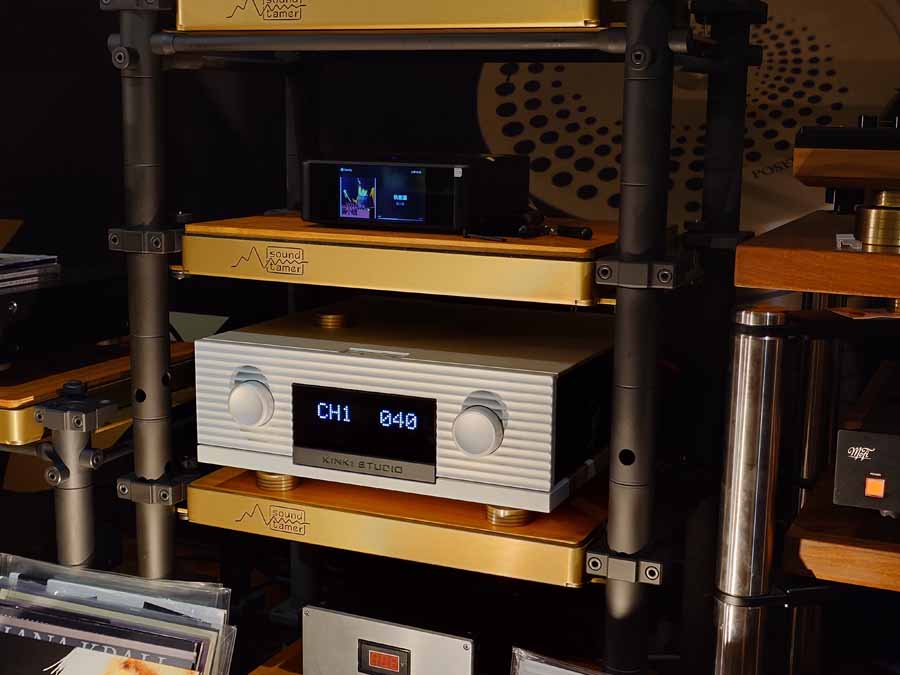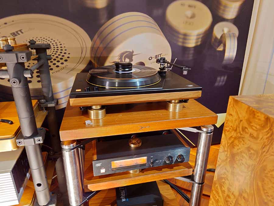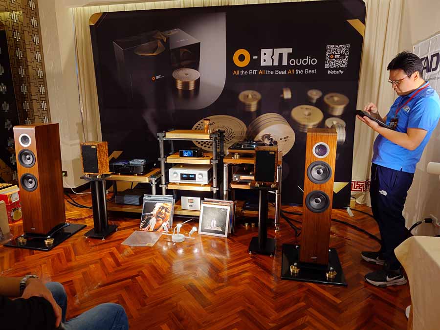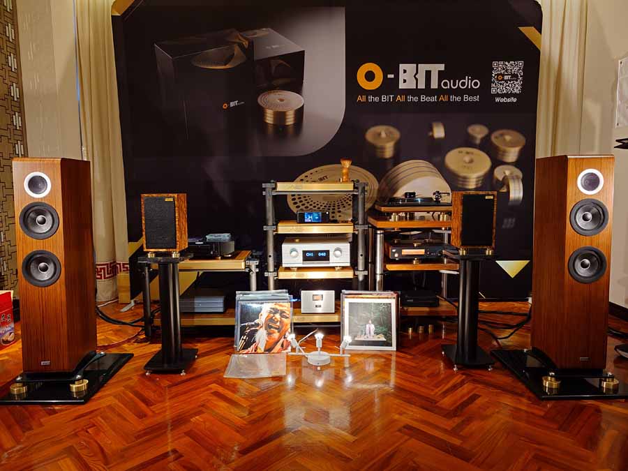 O-BIT’s room was a proper tweaker’s playground dressed up as a very serious system. In the middle of the room were TAD‑E2‑WN speakers connected to a Kinki Studio Dazzle integrated amp, with music coming from a MoFi MasterDeck+ turntable and its matching MasterPhono, while streaming was done by a Bluesound Node Icon, all powered by a Kinki Taihang conditioner on a sturdy Soundtamer suspended modular rack. Of course, every box and both TADs were sitting on O‑BIT’s resonance‑absorbing feet, turning the whole setup into a live demo of what their B‑ and I‑series supports can do under real‑world, high‑resolving gear.