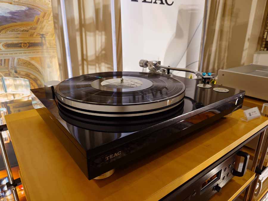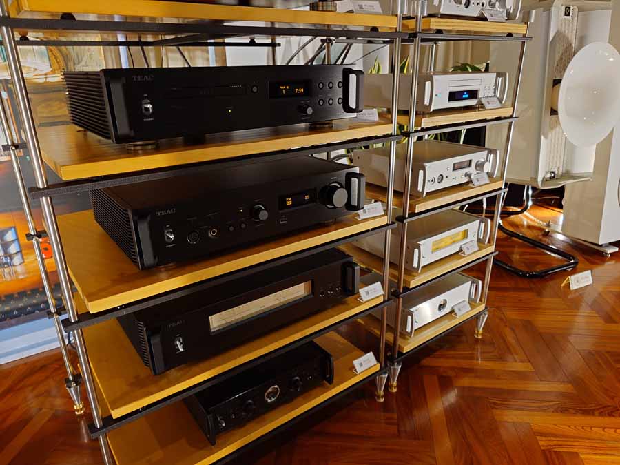 Between the horns sat a double TEAC tower that, for once, I could actually hear rather than just read about. On one side was the 700‑series: VRDS‑701T CD transport, UD‑701N DAC/network player, and AP‑701 dual mono power amp, plus an analogue front end built from the PE‑505 fully balanced phono stage and TN‑5BB belt drive turntable sporting a Dynavector DV‑20X2 cartridge, a deck that neatly blends serious build with everyday friendliness, right down to the arm lifting at the run‑out groove so you don’t have to dive for it. Opposite sat a full 500‑series stack, TEAC’s modular playground of ten separates you can mix and match into whatever system you fancy: the AP‑507 power amp and UD‑507 DAC/pre for a classic two‑box setup, with options to add the NT‑505T CD transport, CG‑10M‑X master clock or NT‑505X network player – or to throw the rulebook out entirely and build a dedicated headphone rig around the HA‑507. The only thing I was missing was the NT-507T, the recently announced network transport with fiber-optic connection – that is very much a piece of gear that I’m looking forward to playing around with!