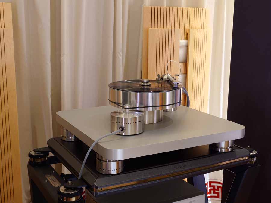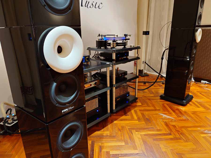 Room 219 was a real ‘turn it up and grin’ place, with Stein Music’s huge High Line Bobby L Signature horn speakers and a full stack of glowing valves. The Origin Live Sovereign Mk4 turntable with the Enterprise Mk4 tonearm was in the front. It was connected to KR Audio P120 and VA910 tube amplifiers, all of which were on solid racks. Stein’s tweaks and Final Touch Ganymede cables connected everything.