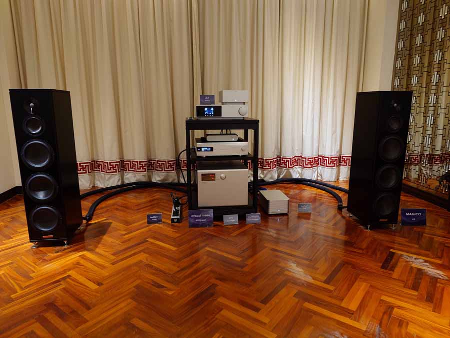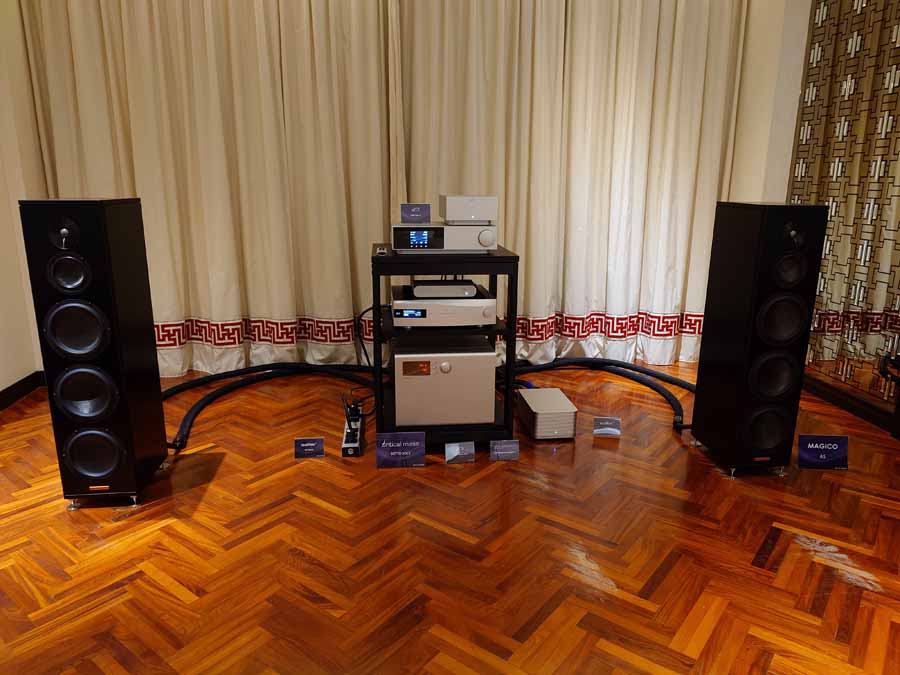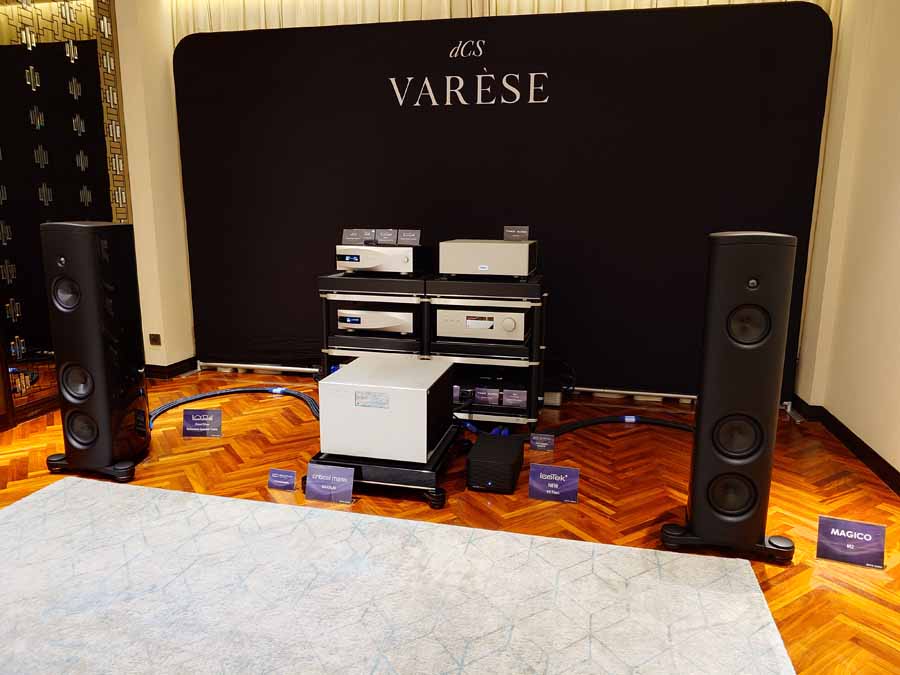 Room 209 was an exercise in ultra‑high‑end system building, with every piece a flagship in its own speciality. At the heart sat a full dCS Vivaldi front end, the Vivaldi APEX DAC, Vivaldi Upsampler/UPnP Renderer, and Vivaldi Master Clock, fronted by a Taiko Audio Extreme server plus its matching Extreme Router, Extreme Switch, and Extreme DC Distributor, essentially a no-compromise computer audio lab dressed in machined metal. All of that fed a Soulution 717 power amplifier and a 727 preamplifier driving Magico M2 loudspeakers; the whole stack was parked on Critical Mass Systems MAXXUM Ultra racks, with IsoTek V5 Titan/Polaris power conditioning and Vyda Reference cabling tying it together. It was one of those rare systems where the digital front end alone looked capable of running an observatory, and it sounded accordingly: immense grip, microscopic resolution, and an almost eerily clean window into the recording.