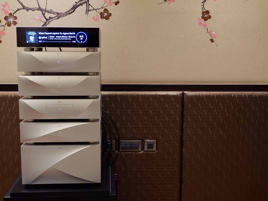 The second setup revolved around DALI’s flagship KORE, a speaker that has been hoovering up praise at major shows around the world and here was given plenty of grip and headroom by two Burmester 218 power amps. Front‑end duties fell to Aurender’s new three‑box N50 transport feeding Playback Designs’ fresh MPD‑8AI – effectively a full preamp thanks to its extra analogue inputs – while an Aurender NH10 switch, full SFP optical networking, and an MC10 rubidium master clock pulled together a very serious streaming front end that felt entirely in keeping with the scale of the KOREs themselves.
