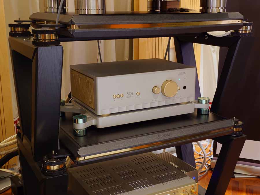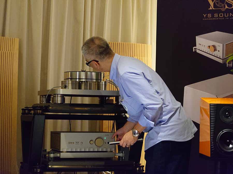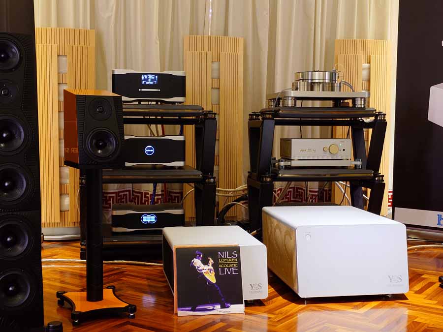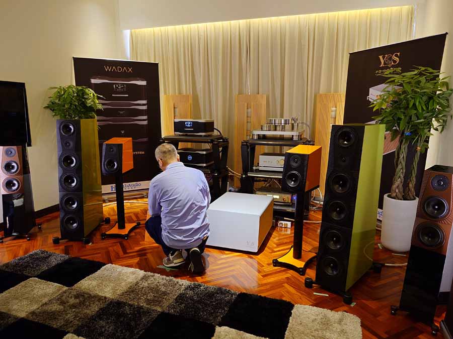 The main room was one of the show’s hotspots thanks to the debut of Storgaard & Vestskov’s loudspeakers. A small delegation, including Casper and Henrik, had flown in to celebrate the brand’s first outing in Asia, and they certainly brought some colour with them: Fenja in vibrant Wasabi Green, Frida in Papaya Yellow, and Gro in Bentley Copper. They sounded as good as they looked and quickly became a talking point in the corridors. YS Sound’s electronics not only took up the majority of the room but also created a sense of mystery. This Japanese brand produces high-end amplifiers in limited quantities, with no website or specifications available. The analogue source was the minimalistic yet sculptural BASIS A.J. Conti Transcendence with SuperArm tonearm, a fascinating turntable built around a massive, vacuum‑hold‑down platter, Synchro‑Wave power supply and ultra‑thin precision belt for exceptional speed stability and noise floor. The digital side featured a full Wadax Studio front end, with the player, clock, and PSU all arranged like sci-fi lab equipment.
