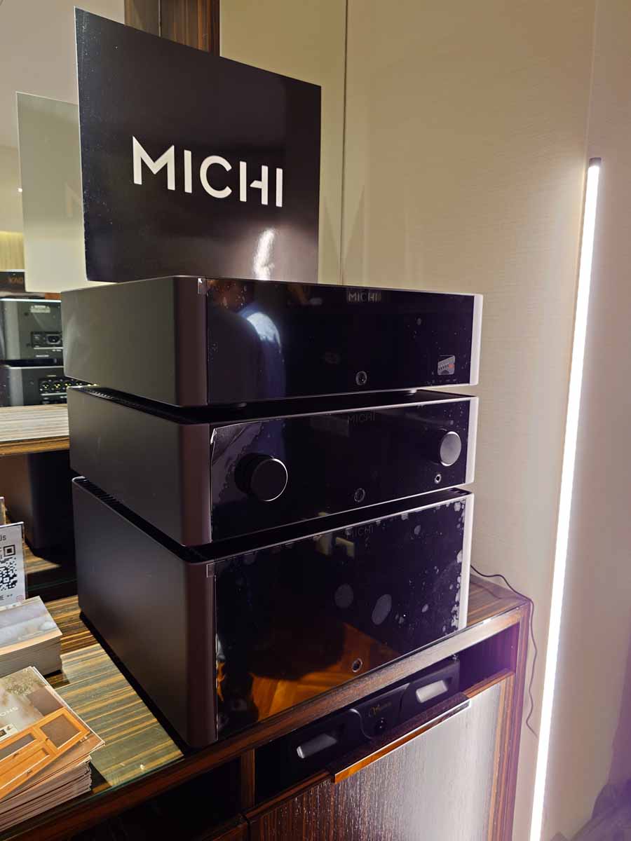 Visitors to this room were greeted by two well-proportioned systems. The main attraction was a clean white setup with Kaiser Acoustics’ Furioso Mini standmounts on matching sculpted stands. The sound was powered by a full stack of Hegel electronics, which are known for their tight, low-noise, high-grip sound. Things got more romantic along the side wall, where a line of Jadis tube electronics fed Vienna Acoustics Mozart Grand floorstanders with an Arcam ST25 streamer as the source. This was a very civilised ‘European evening in’ option compared to the ultra-neutral Kaiser/Hegel combo.