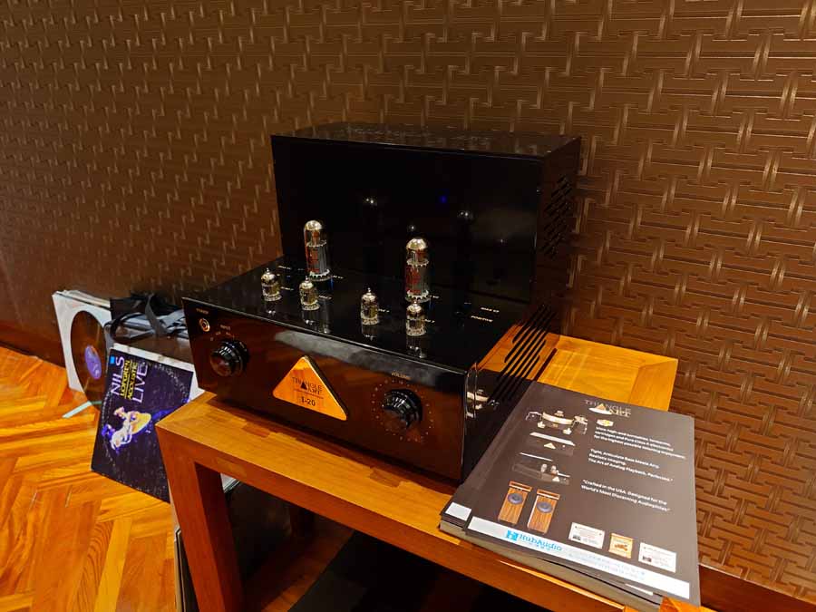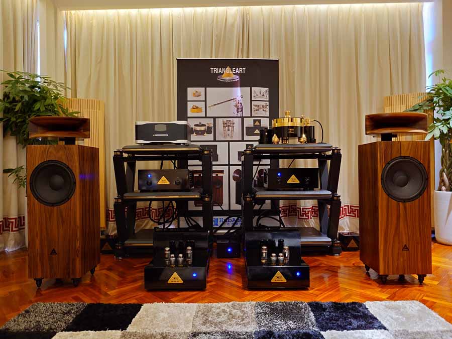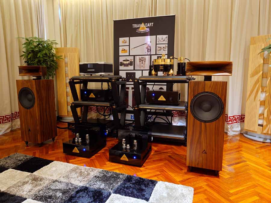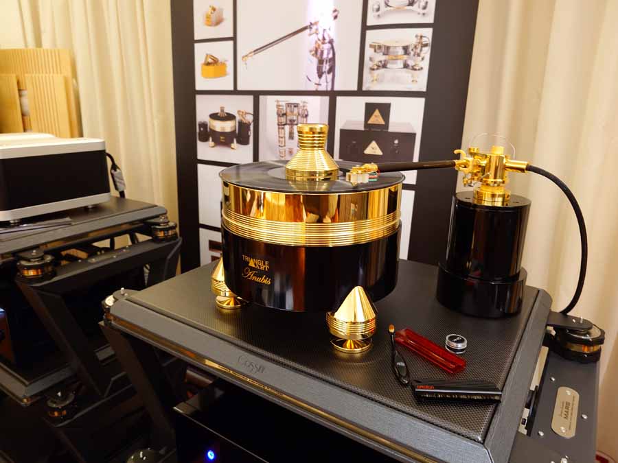 My first proper encounter with TriangleART occurred in the more secluded inside room, and they definitely took the “go big or go home” approach. The Anubis turntable caught my attention when I first stepped in the room, paired with a 12-inch Osiris Mk II tonearm and TriangleART’s Apollo MC cartridge, complete with a solid boron cantilever and micro-ridged solid diamond stylus—very much a statement analogue front end. From there, the signal ran through a full suite of valve electronics: the P‑200 phono stage into the L‑200 tube preamp and then the M‑100 power amplifier, using pairs of direct‑heated KT120 output tubes and 6SN7 drivers per channel in Class A push‑pull triode mode. The whole lot then hit the big Selena horn loudspeakers via a full loom Gutwire cable. Visually it was all polished metal and shiny gold; sonically it was exactly what the looks promised – big, saturated and dynamically unrestrained, the kind of system that makes vinyl feel gloriously larger than life.