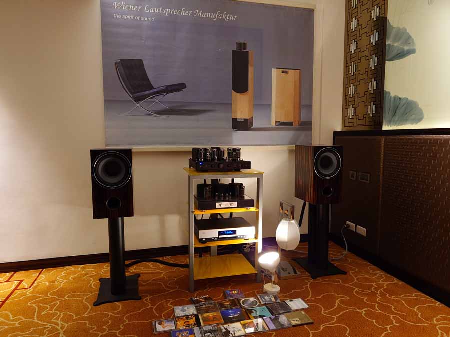 The Diva MkII speakers from Wiener Lautsprecher Manufaktur were doing their high-efficiency, big-tone thing in a small, windowless room. A Cary Audio SLI-80 integrated tube amplifier with a matching Cary CD player up front powered them. A little time travel, with the CDs spread out in front of the rack. It sounded great, though.