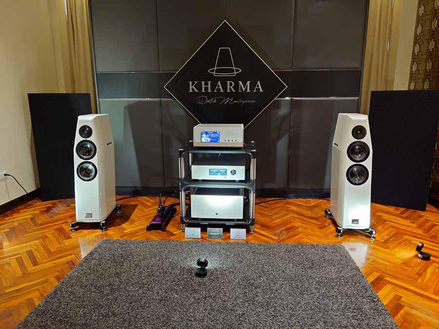 The Kaiser Kawero! Grande system was one of the most imposing yet refined setups at the show: nearly 6‑foot‑tall, twin‑cabinet loudspeakers weighing around 235 kg each, using a multi‑way array with a big rear‑firing woofer and RAAL ribbon tweeter to cover the full range with ease. Driven by the H-TWO 33BD Opus II fully balanced preamp, the Orpheus Heritage Ultimate power amplifier, and the Aqua Acoustic LinQ streamer, the system delivered a huge, deep soundstage with a very natural, unforced treble and a “big but nimble” presentation that made loud, dynamic tracks feel effortless rather than aggressive.