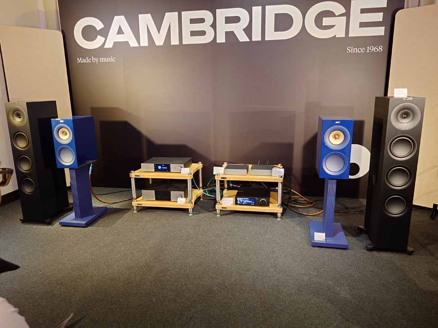 This was the first time I saw a full room dressed in Cambridge’s new branding, and they clearly wanted it to stick in my mind. The EXN100 streamer and EXA100 amplifier were paired with KEF’s Q11 Meta floorstanders, and the EVO 150 SE all-in-one took turns driving a pair of bright blue KEF R3 Metas. Cambridge also had their AXE entry-level separates and Melomania headphones on display all the time around the sides. Nice vibes.