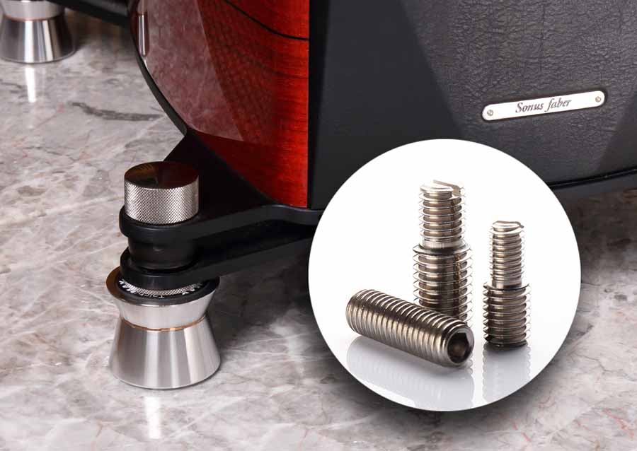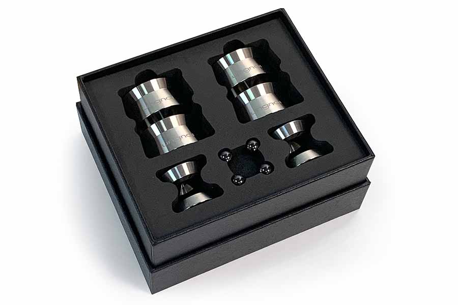 The Taichi MAX includes interchangeable stainless steel threaded studs (M6, M8 and M10), enabling use with floorstanding loudspeakers and HiFi racks. Each unit measures 46.5mm in height and 53mm in diameter, with a ceramic ball diameter of 14.3mm. Maximum recommended loading is 132kg per four units.