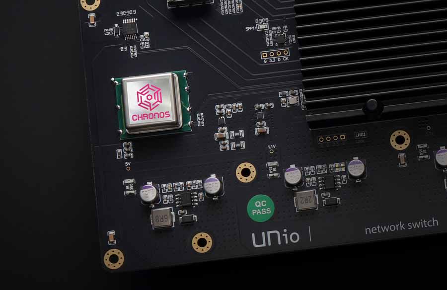 At the core of the UNio Poki Network Switch is a CHRONOS Class internal clock module selected for low phase noise performance. UNio states that its production process involves temperature-controlled testing, where one clock is chosen from batches of 20–30 quartz devices to act as the reference oscillator. This approach is intended to promote timing stability and data accuracy across supported network speeds.