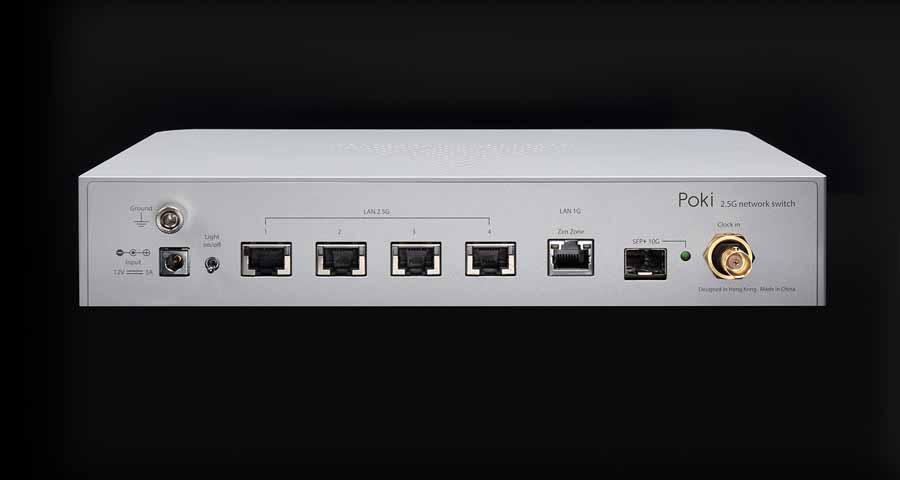 The rear panel includes a grounding terminal and DC power input on the left. Centrally, there are four RJ45 ports supporting 2.5G data transmission. On the right is a dedicated 1G “Zen Zone” RJ45 port, internally isolated and intended for connecting a primary streaming device. The Poki also incorporates an SFP fibre optic port supporting 10G or 1G operation for connection to SFP-equipped devices or for daisy-chaining additional network hardware. A 10MHz external clock input is provided for users intending to integrate an external master clock.