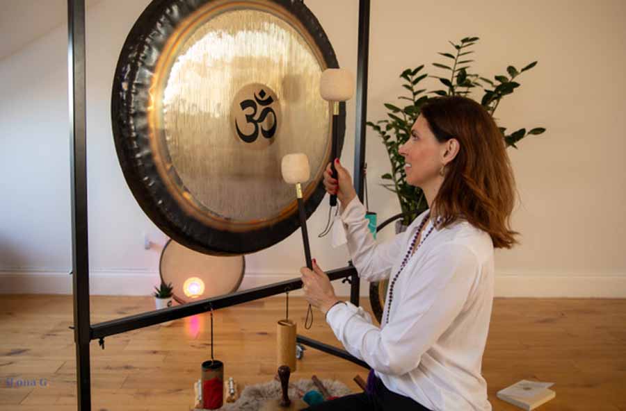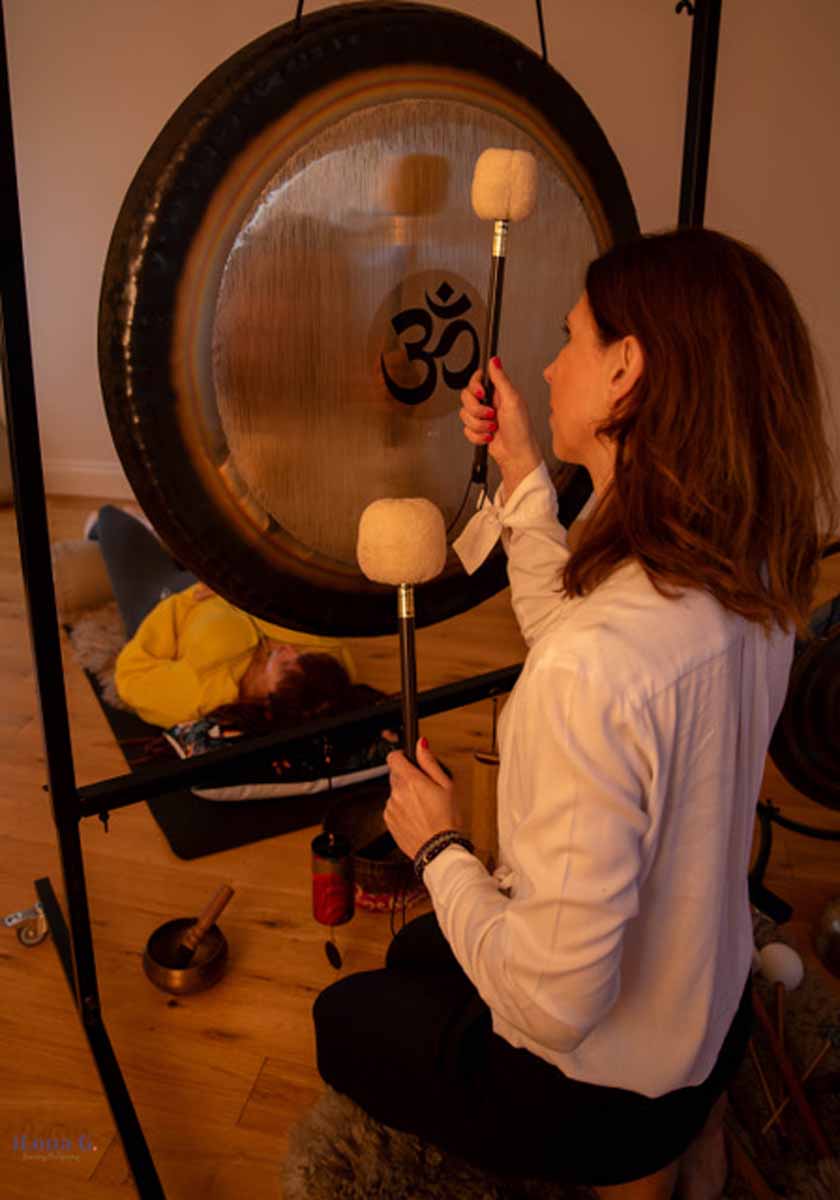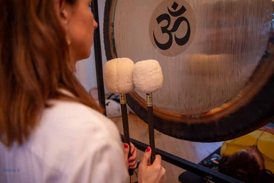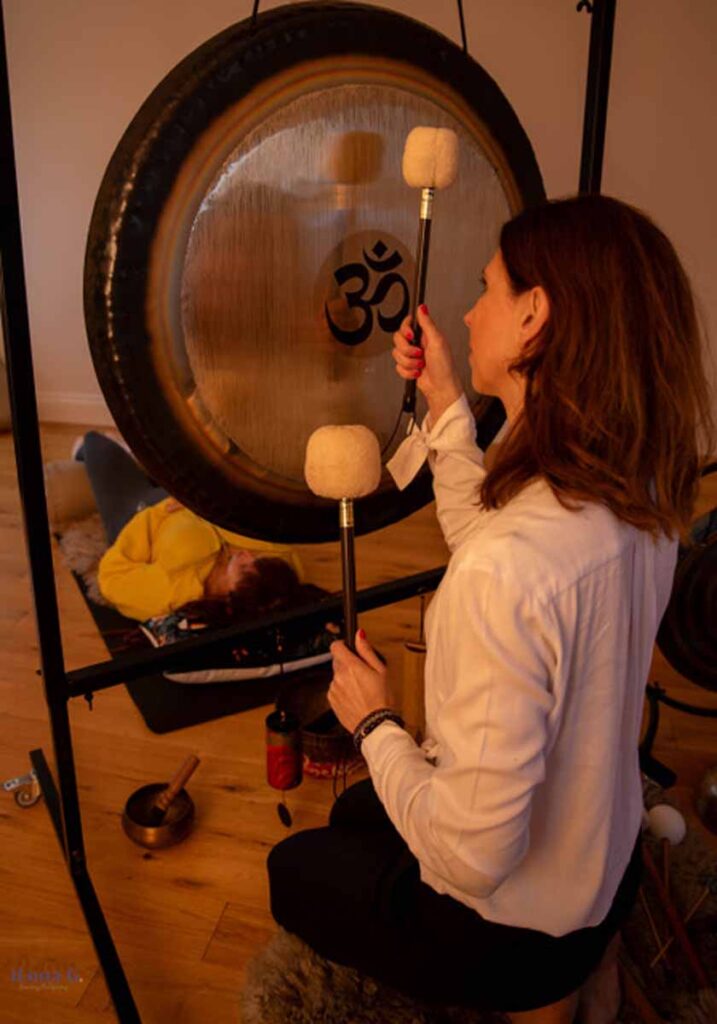 Richter is a certified sound therapy practitioner and holistic psychologist who works with symphonic gongs and crystal singing bowls. Her sessions use sustained tonal frequencies to encourage relaxation and mental clarity. The approach is based on the idea that certain sound patterns can help slow brainwave activity, which is associated with rest, recovery, and emotional processing. Participants are invited to sit or lie back, close their eyes, and focus on the evolving soundscape during the sessions.