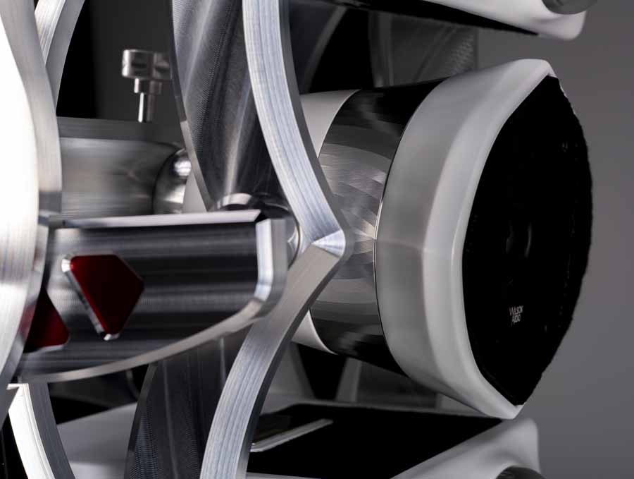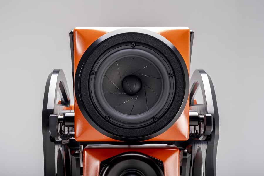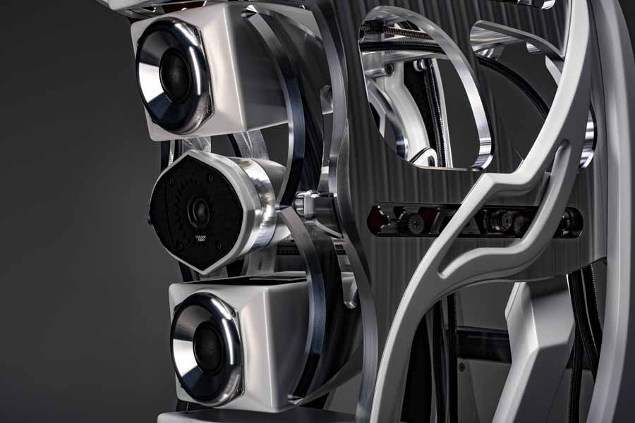 The woofer enclosure retains full material thickness behind the drivers, while the crossover housing is constructed from carbon fibre and mounted to a vibration-damping structure. Various layers of constrained materials are used to manage resonance and structural integrity.
