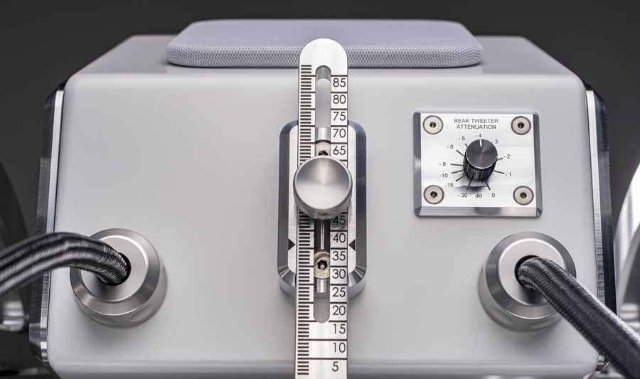 A rear-firing tweeter operates between 6 kHz and 22 kHz and includes adjustable attenuation, allowing users to tailor output to room acoustics.