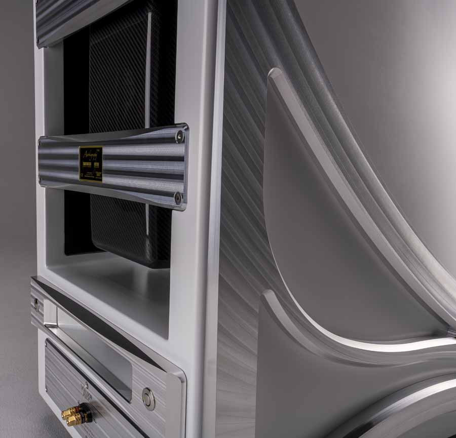 A range of materials is used throughout the construction of the loudspeaker, including high-density phenolic composites, carbon fibre, aluminium, stainless steel, and copper. These materials are applied in different parts of the enclosure and structure based on their mechanical and acoustic properties.